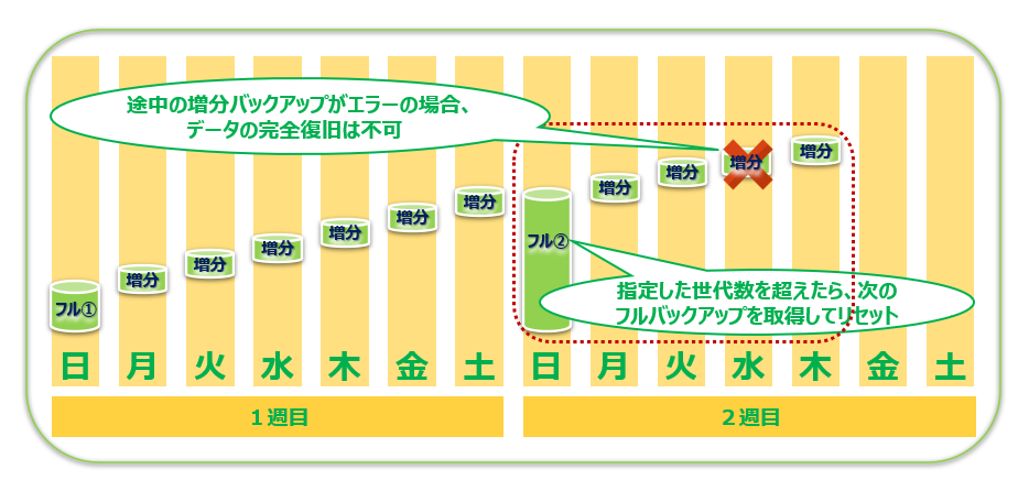 つまり、週末の「フルバックアップ」に平日の「増分データ」を積み重ねていく訳です。