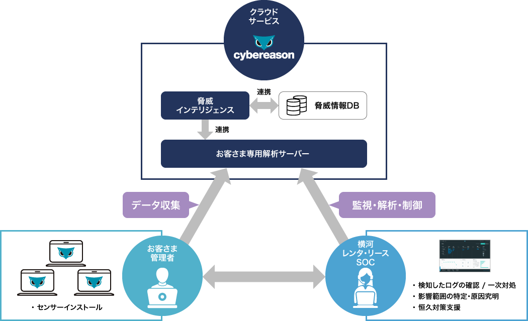お客さまが利用されているPCなどにインストールされたEDRから集められたデータはクラウド上に蓄積され、それを当社が提供するSOCが常時監視、異常検知時には、感染拡大の防止や、影響範囲の特定、原因究明、そして供給的な対策など、さまざまな支援を行います。