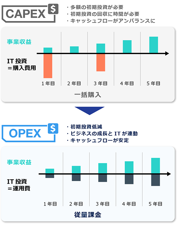 こうした状況下でIT部門はいかに効果的にIT投資を計画したらよいでしょうか。一つのヒントとなるのが、「CAPEX (資産)」から「OPEX (運用費)」へのシフトです。すなわち、ITリソースの調達を「購入」から「利用」に転換することで、ITリソースの使用量に対して費用を支払い、さらにIT運用を効率化することで保守、運用にかかるコストを圧縮するとともに、IT部門が本来行うべき業務にシフトできるようにすることです。財務面でもオフバランス化できるため有効な手法といえるでしょう。