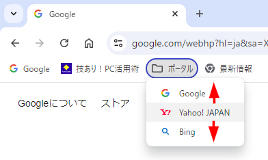 ブックマークバー上にあるフォルダにフォーカスが当たれば、「Enter」キーあるいは下の「矢印」キーでフォルダ内のブックマークがメニュー表示されるので、上下の「矢印」キーでフォーカスを移動させて「Enter」キーで開くことができます。