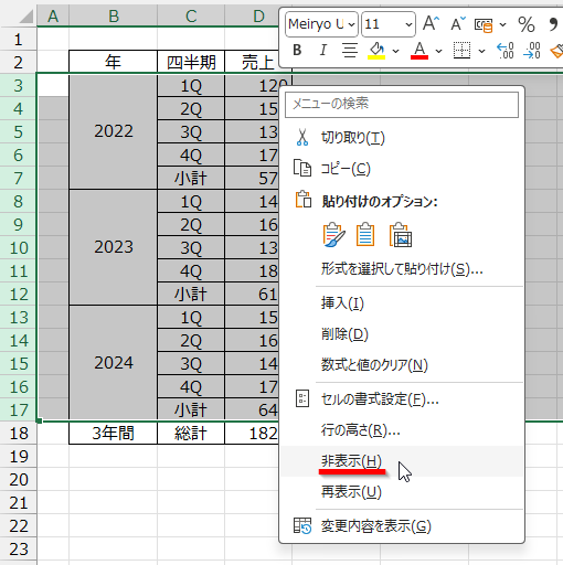 ただし、この方法では「非表示」したあと、どの「行」や「列」に適用したのか一見しただけでは分かりにくいし、「再表示」するときもメニューを使うので少し手間です。