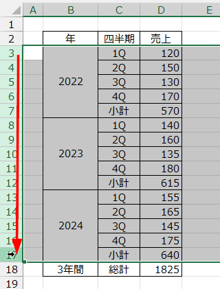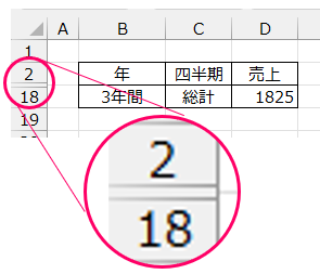 「グループ化」するには、まずは「行」ならシート左端の「行番号」、「列」ならシート上端の「列番号」の上で、マウスの左ボタンを押しながらドラッグして範囲選択します。