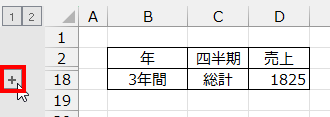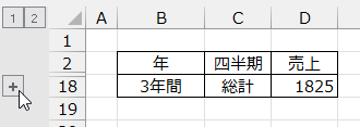 非表示となったら「-」のボタンは「+」ボタンとなり、その状態で「+」ボタンをクリックすると「グループ化」された「行」や「列」がラインで表示されます。