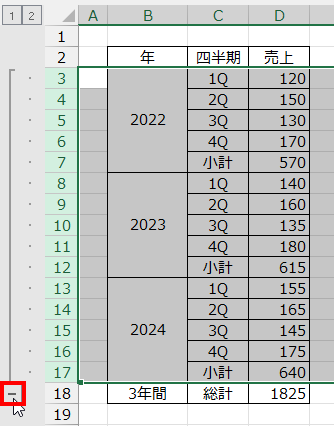「グループ化」された「行」の左、あるいは「列」の上に同じ「グループ」の「行」や「列」を示すライン (線) が表示され、ラインの下端にある「-」ボタンをクリックすると「非表示」にできます。