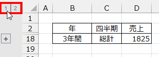 「グループ化」された「行」を示すラインやボタンが並ぶ上端、「列」を示すラインやボタンが並ぶ左端には「数字」の階層ボタンがあります。