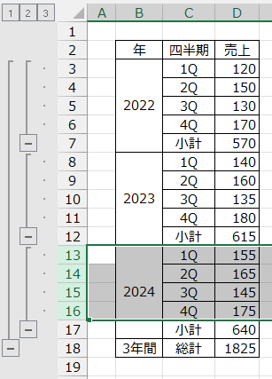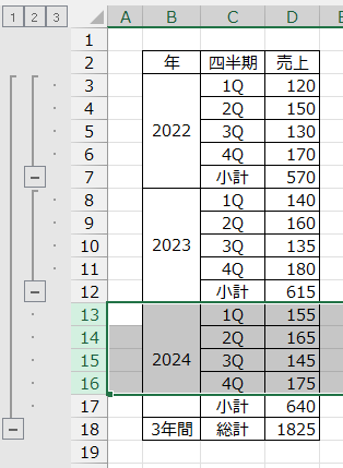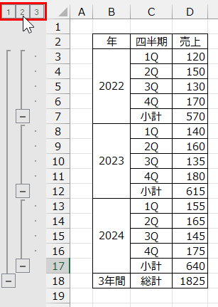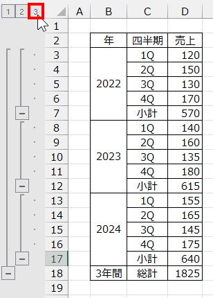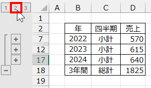 例えば「グループ化」した複数の「行」の中から、もう一段「グループ化」すると階層ボタンが「3」に増えます。