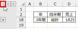「1」ボタンで「1」のライン上にある「グループ」が非表示となります。