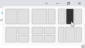さらにウィンドウのサイズと配置を6つ表示して、そこから選んで「 スナップ 」ができる「 スナップレイアウト 」も用意され、実際に「 スナップ 」したいウィンドウの右上にある「 最大化 」ボタンにマウスカーソルを合わせるとポップアップ表示されます。