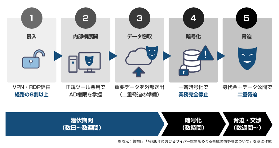 警察庁の調査 (*3) では、VPN機器やリモートデスクトップからの侵入が感染経路の8割以上を占めています。