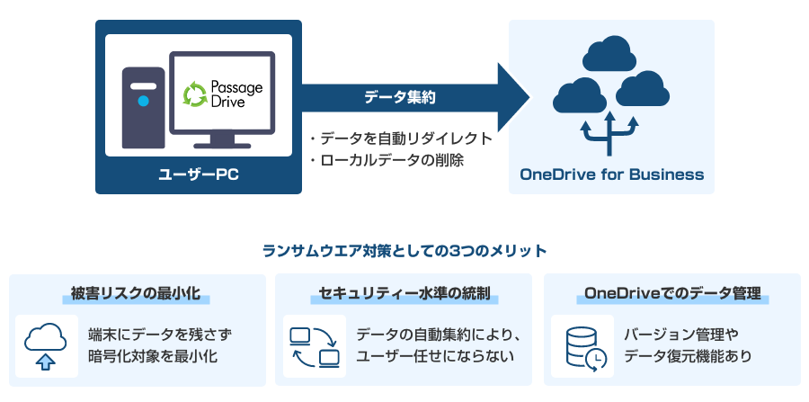 第一に、Passage Drive は端末上のデータを One Drive へ集約したのち、ローカルのキャッシュデータを削除するため、暗号化される対象が大幅に減り、被害を最小化できます。