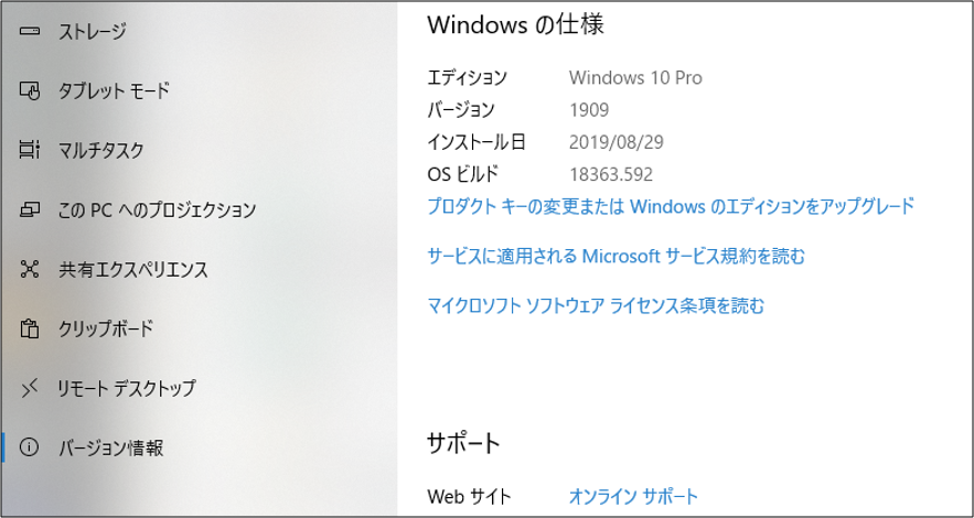 図例の場合、「 Windows 10 バージョン1909 OSビルド18363.592 」ということになります。