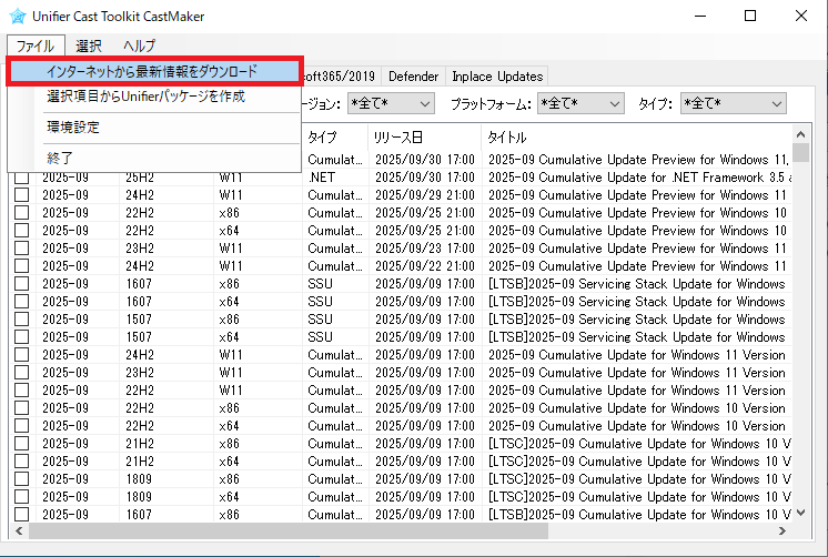 ① CastMaker を起動し、[ファイル] > [インターネットから最新情報をダウンロード] を選択します。
